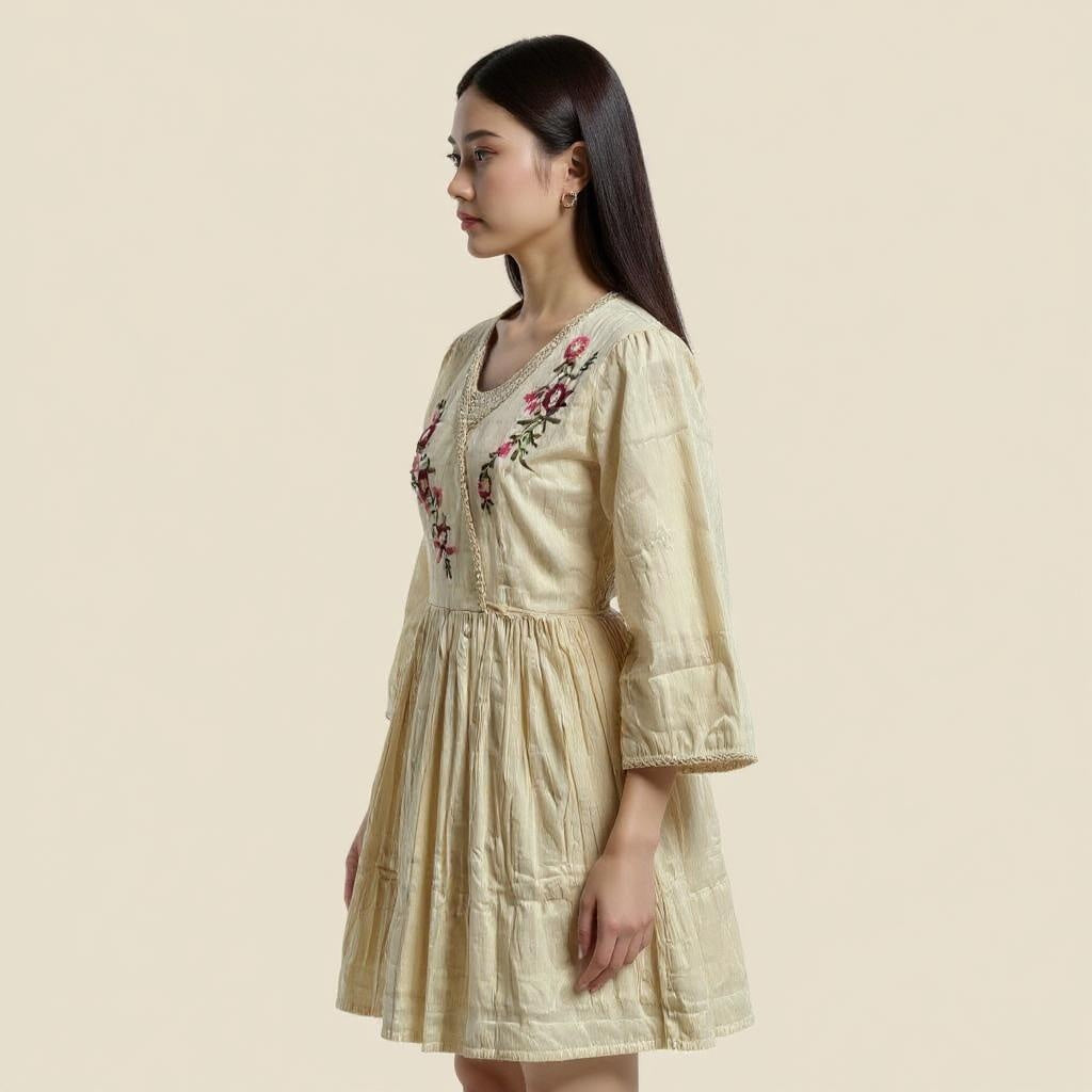 This Khadi one-piece dress for women features delicate embroidery and a relaxed slim fit, combining traditional craftsmanship with contemporary style. Crafted from breathable Khadi fabric, it ensures comfort and durability, making it ideal for both casual and semi-formal occasions. The tailored silhouette flatters the figure while allowing ease of movement, reflecting expert design and attention to detail. Perfect for those who appreciate sustainable fashion with a refined touch.
